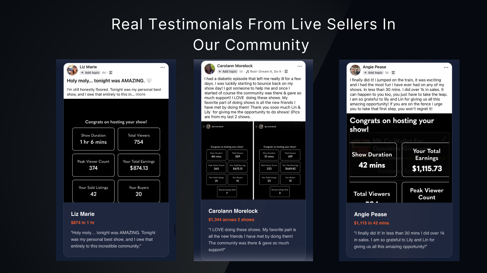 You’ll get weekly live workshops every Tuesday at 4PM PST (all recorded), real-time coaching, and access to our proven show flow that has helped generate over $10,000,000 in live sales.