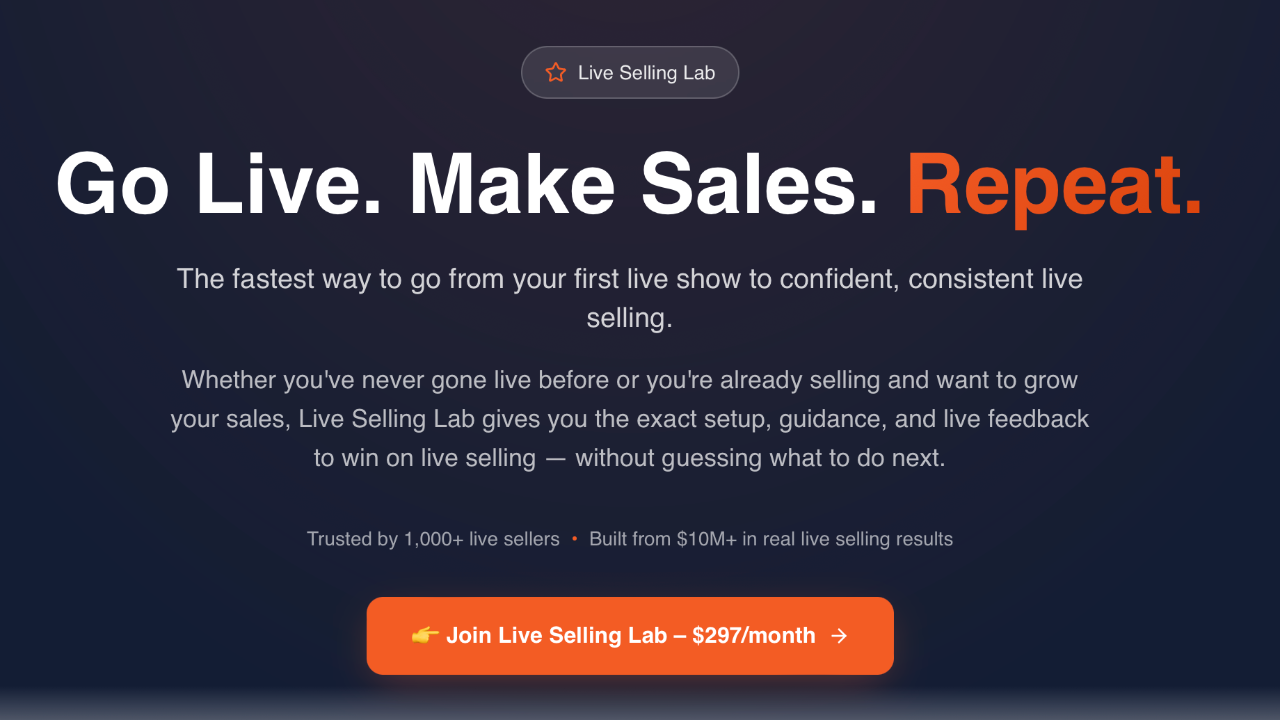 Live Selling Lab is a weekly live group coaching workshop where we help you get set up, go live, and sell with confidence — even if you’re just getting started, or you’re already live and want more consistent sales.